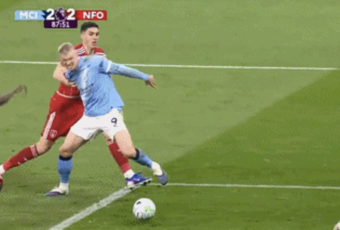 第87分钟,比分2-2,曼城将球传到禁区里,哈兰德左脚把球停下,然后试图射门。此时,后卫将哈兰德拉住,曼城锋霸失去平衡,随即倒在地上。不过,裁判依旧没有给点球。