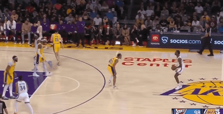 其二,便是亚历山大秒传多尔特助队友完成锁定胜局的一记暴扣。当时,比赛还剩下21秒,雷霆手握球权且有两分的领先优势。原本多尔特由韦少看管,但韦少却在防守移动的过程当中漏掉了自己的防守人。湖人重兵围堵之下,亚历山大发现了无人看管的多尔特,他跳起将球传到了多尔特手中,最终助雷霆赢下了本场比赛的胜利。
