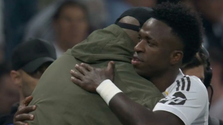 04月08日讯 欧冠1/4决赛首回合比赛,拜仁客场2-1皇马。在下半场开始前,维尼修斯径直走向拜仁教练席,与孔帕尼击掌拥抱并短暂交流。